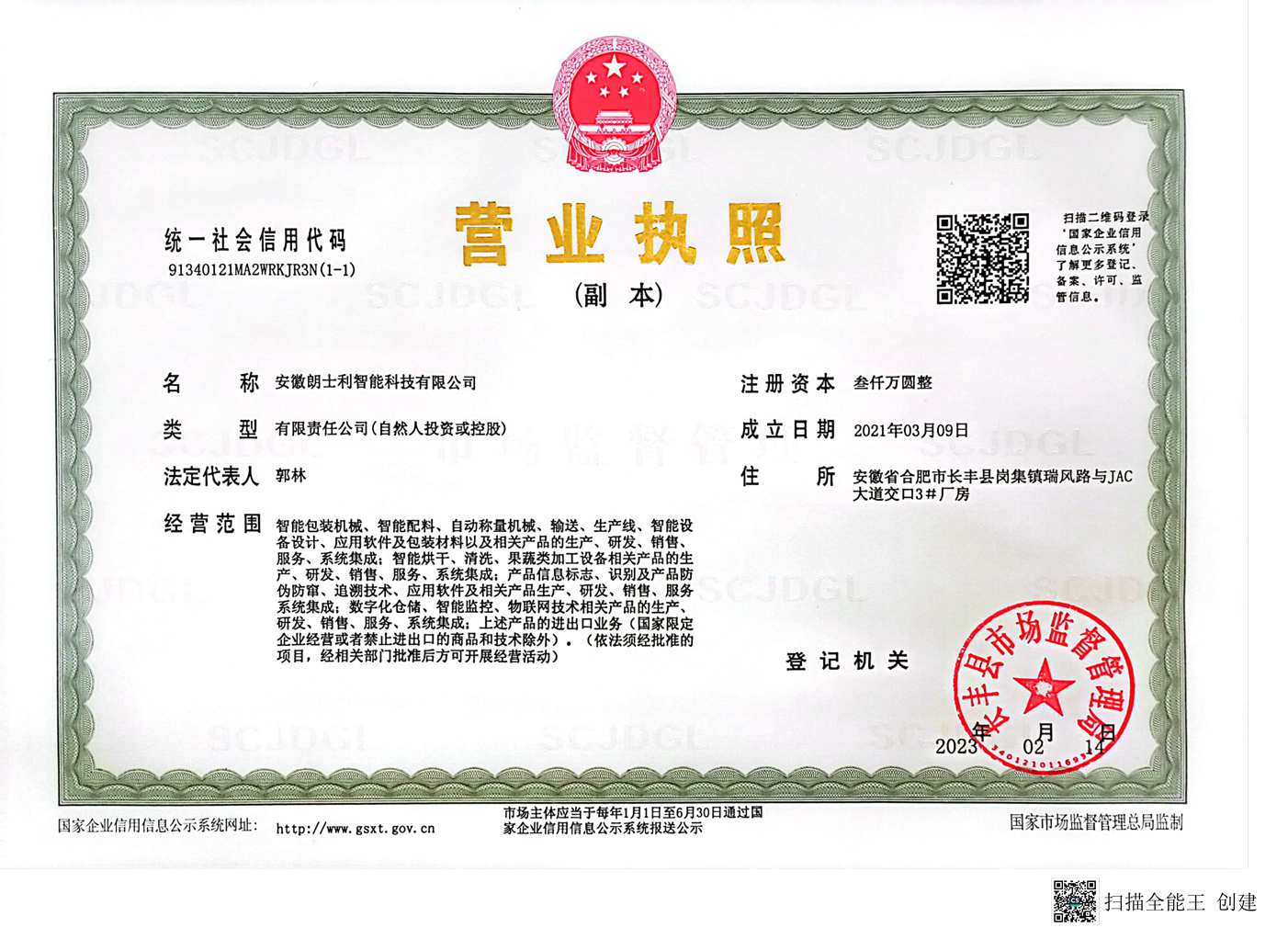 安徽朗士利智能科技有限公司“智”動化,讓生活更美好企業簡介:安徽朗士利智能科技有限公司創建于2021年,是一家致力于包裝設備的設計、制造與銷售,專業從事自動化包裝機械的研發、生產、銷售、服務于一體的制造公司,公司坐落在國家重要的科研教育基地和科技之城--合肥,注冊資金3000萬,主要產品如:立式卷膜制袋機、水平卷膜制袋機、預制袋給袋機、液體灌裝機、粉體包裝機、顆粒包裝機、貼標機、輸送機等產品已在制藥、日化、食品、農藥、化工、獸藥等行業廣泛使用,部分產品遠銷歐洲、美洲、中東、東南亞等地區。公司擁有一批行業內從事工藝設計、機械制圖、電氣自動化等領域十年以上經驗的專業型人才,形成一支高素質年輕化且富團隊創新精神... 查看更多+